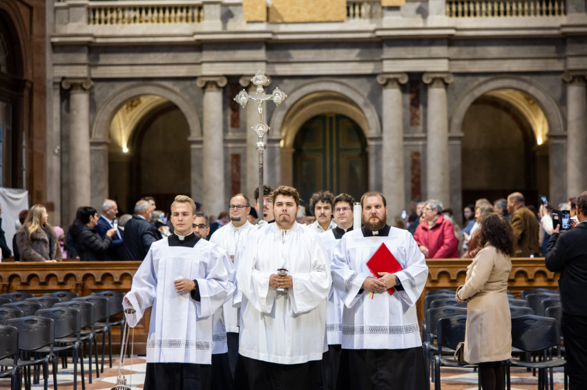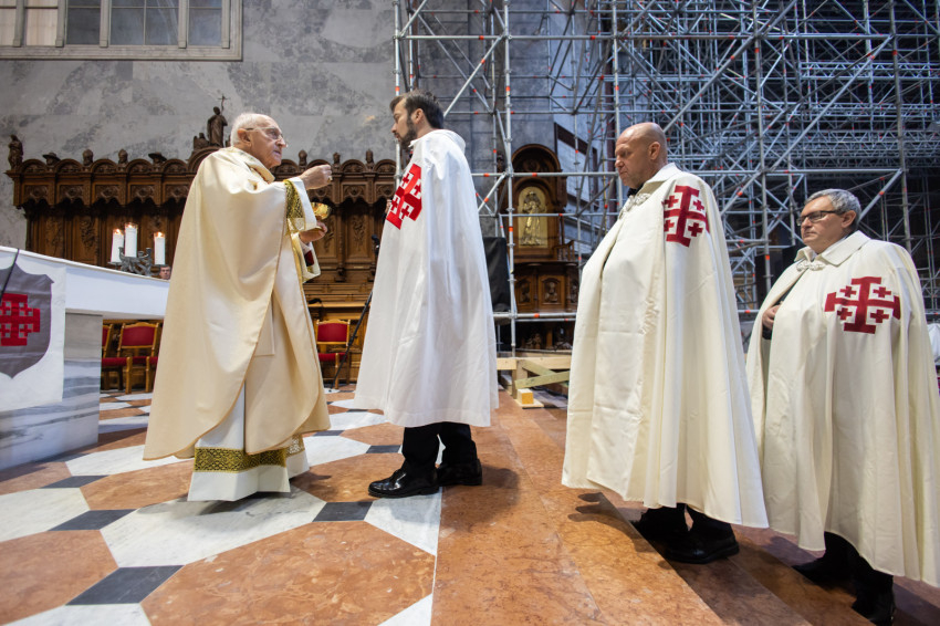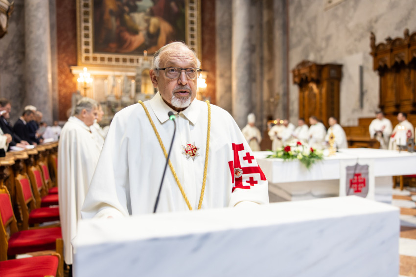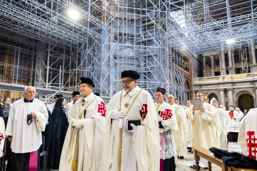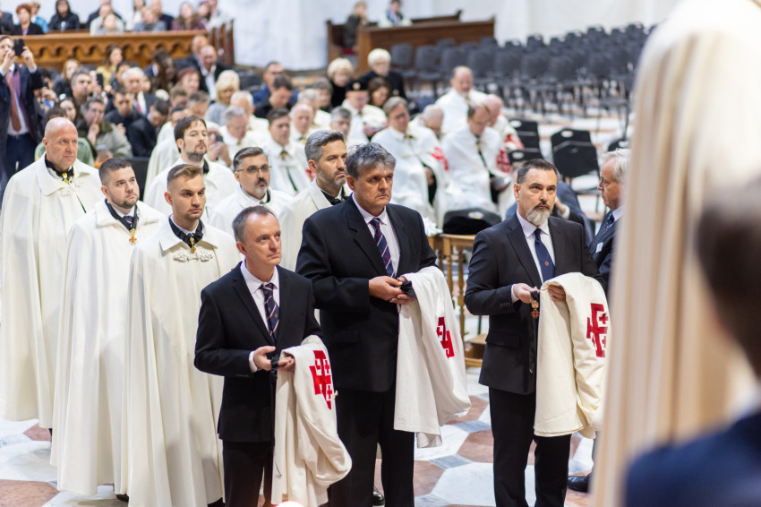 A mai szertartással kiteljesítettük az invesztitúra szertartását, melyet tegnap este kezdtünk meg az ünnepélyes imavirrasztással. Ma lett szentesítve az új lovagok felvétele a Jeruzsálemi Szent Sír Lovagrendbe a rendi kereszt felvételével és a nagymester áldásával, valamint a köpeny felöltésével, a rendi vezetők segítségével. A köpeny a mi díszruhánk és a rend jelvényével ékes: a jeruzsálemi ötös kereszttel. Ünnepélyes pillanatot élünk át tehát, amely kitörölhetetlen marad életetekben. Még a nehéz időkben is emlékezzetek arra a kiváltságra, amelyet Krisztus az Egyház révén adott nektek, mert a Jeruzsálemi Szent Sír Rend tagjává lenni egy igazi és magasztos kiváltságot jelent; érezzétek át a rendi tagság megtiszteltetését és szépségét, és legyetek mindig méltók rá.
