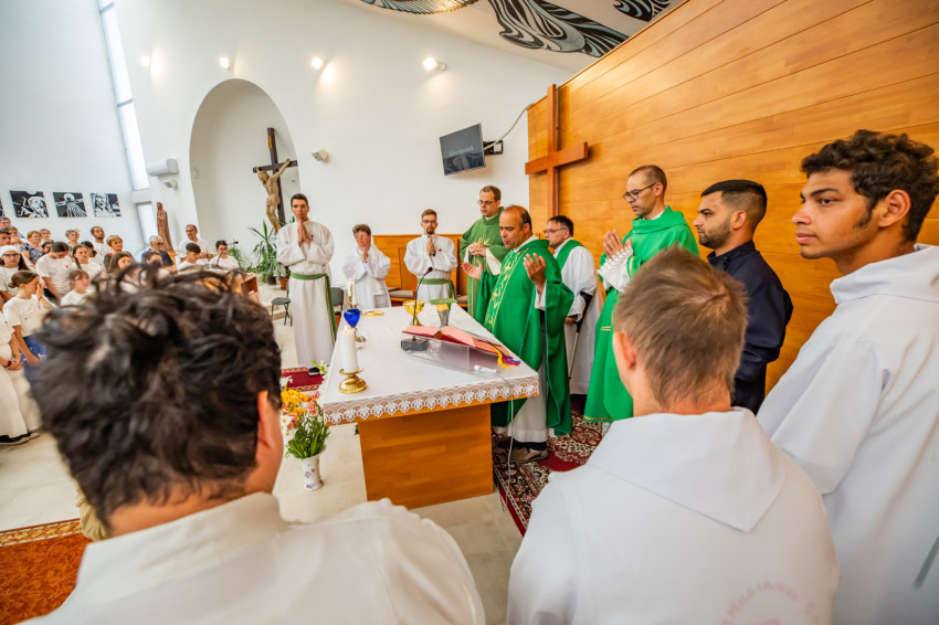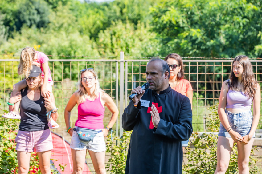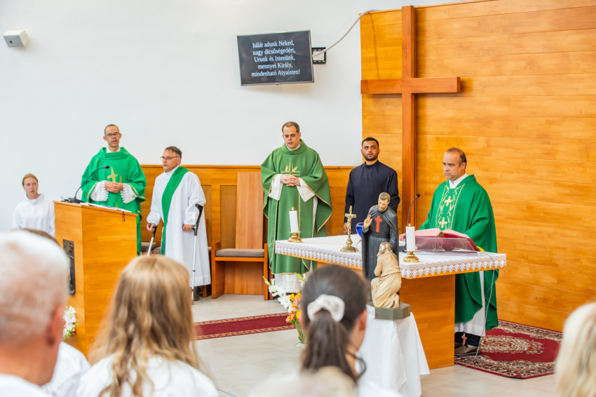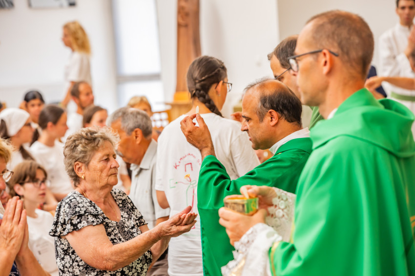 A vasárnapi szentmisén az új tábori pólót viselve vettek részt a fiatalok. A szentmisét a helyi egyházközséggel együtt a borbányai Szent László római katolikus templomban ünnepelték. Frédi atya prédikációjában arra is felhívta a figyelmet, hogy egyik kezünkkel mindig fogjuk Isten kezét, a másikkal meg embertársunkét, utalva ezzel a tábori mottóra is, amely magában foglalja az életprogramot: TaTeSze – találékony, tevékeny szeretet. A programok gördülékeny levezetésében az önkéntesek, a tábor szervezői és az intézmény dolgozói fáradságot nem ismerve szolgálták a táborozók mindennapi örömét.
