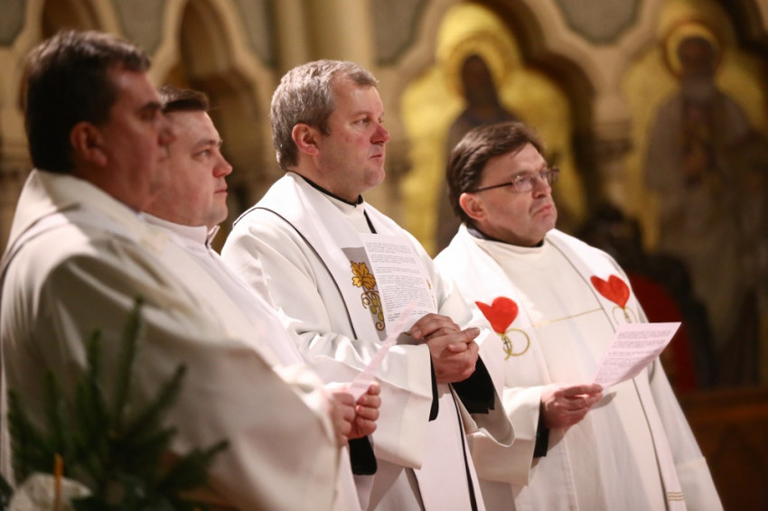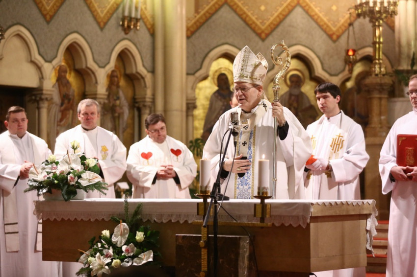 Erdő Péter bíboros a szentmise elején hálát adott azokért az értékekért, amelyeket a Mária Rádió közvetít, valamint a munkatársakért és önkéntesekért, kérve rájuk Isten áldását.