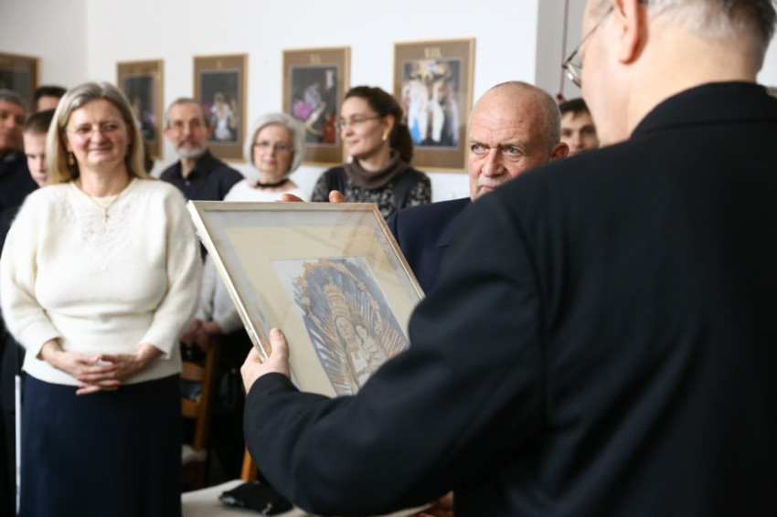 A rádió munkatársaival való találkozás elején Szabó Tamás, a Mária Rádió elnöke köszöntötte Erdő Péter bíborost, átadva neki a Mária Rádió ajándékát. Az átadott festmény, amely a Csíksomlyói Szűzanyát ábrázolja, a rádió munkatársainak Mária gondoskodásába vetett reményét fejezi ki. Amint arra az igazgató rámutatott, 2005 májusában, pünkösd éjjelén, öt évi nehéz és eredménytelen munka után a Csíksomlyói Madonnához fordultak, kérve segítségét a rádió működésében. Ennek a „felajánlásnak” az eredményeként két hónap múlva találtak egy eladó rádióépületet, és találtak olyan önkénteseket, akik vállalták a rádióban való szolgálatot.