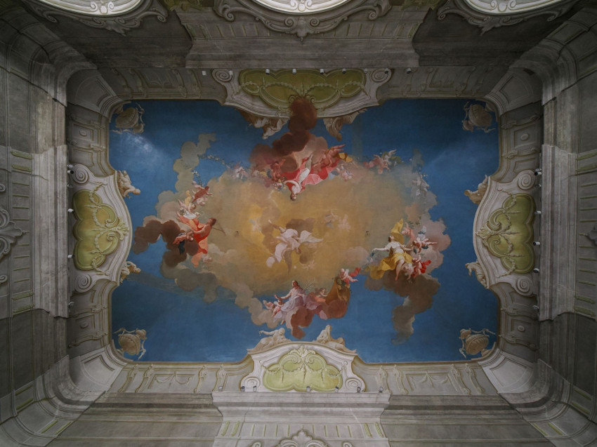 A mennyezetkép – amelyen a csillagjegyek és az időjárás szimbólumai is láthatók – ugyanis nem csak dekoráció, több jelentésrétege is van; a festményt akár antik mitológiai utalásokba rejtett püspöki hitvallásként is lehet értelmezni. Az alkotásnak ugyanakkor nem csak a jelentése okozott fejtörést, Cimbal festéstechnikája is váratlan feladat elé állította a restaurátorokat.