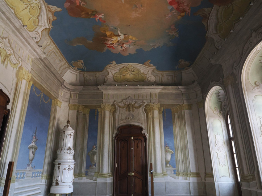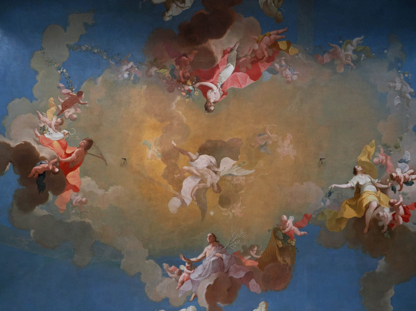 A világegyetemet körforgásban tartó kétarcú istenség, a négy évszakot szimbolizáló női és férfialakok, a bolygók jeleit kezükben tartó puttók és egy titokzatos utalás a 18. században a palotát építtető veszprémi püspök, Koller Ignác születésnapjára – többek között ilyen részletek láthatók a veszprémi érseki palota dísztermének barokk mennyezeti festményén.