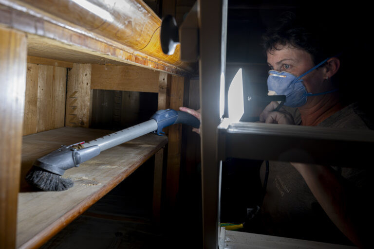 Beindult az ilyenkor szokásos felderítési protokoll: soronként és polconként haladtak végig, megmozdították a könyveket, és keresték a károsítók jeleit. A feltérképezés azért is különösen fontos, mert ki kell deríteni, hogy például kenyérbogár – amely a pannonhalmi könyvtárat megtámadta –, kopogóbogár, vagy akár a lakásunkban is előforduló ezüstös pikkelyke okozza-e a fertőzést. Mindhárom erősen károsíthatja a könyvállományt és – ami Román Árpádék szempontjából különösen fontos – a fabútorzatot is.