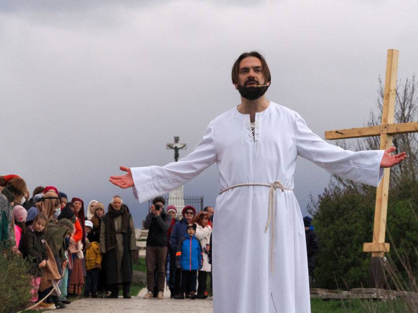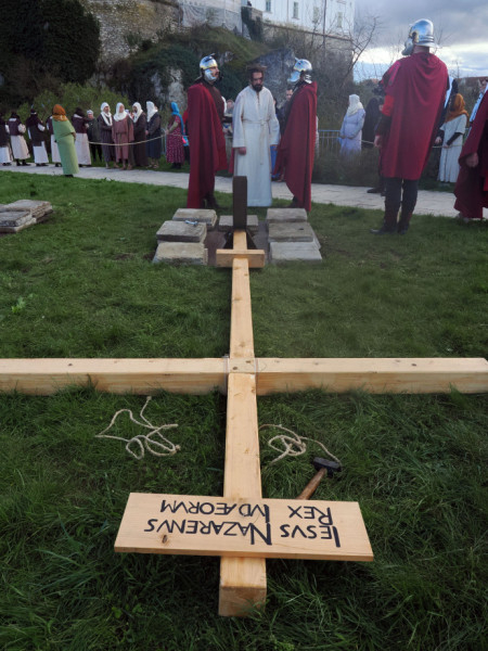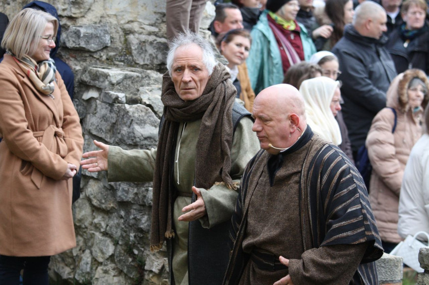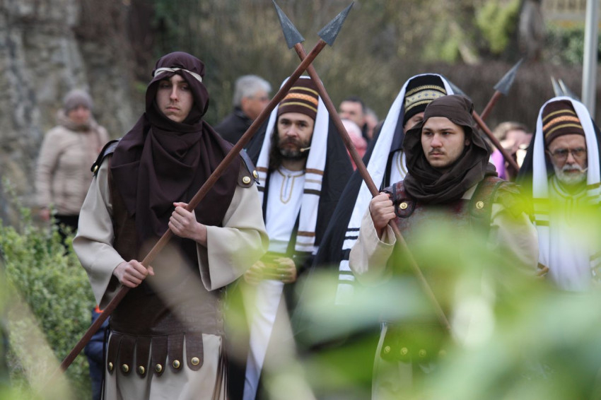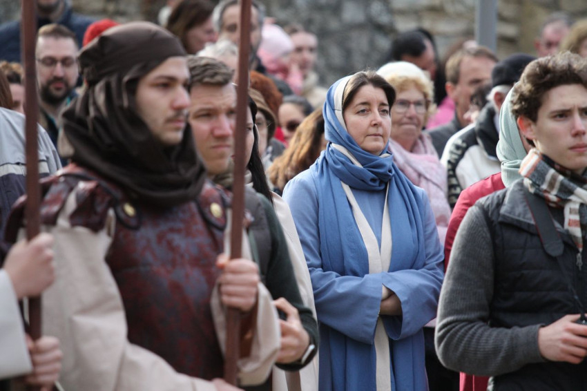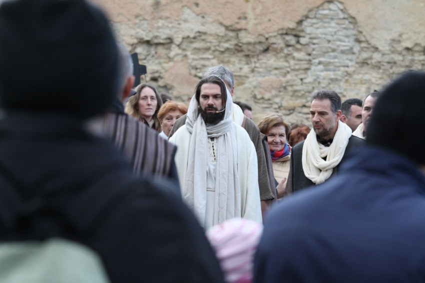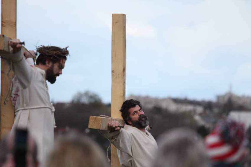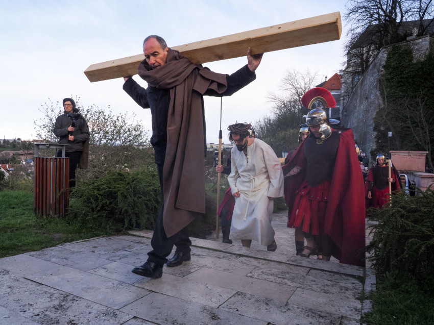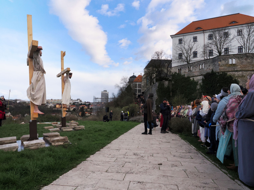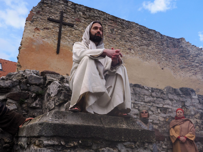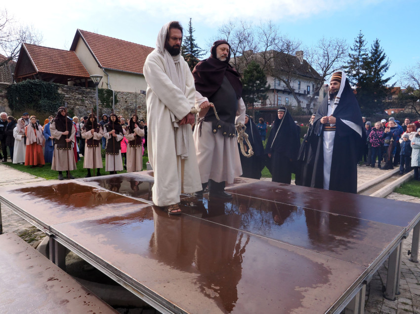 Jézus szenvedéstörténete Kiss György rendezésében elevenedett meg. A megrendítő misztériumjátékot több mint ezer néző követte a Margit-romoktól a rózsakerten és a Patak téren át a Benedek-hegyig, akiknek kedvét a hétvégi erőteljes lehűlés, a jégdara és a feltámadó szél sem vette el.