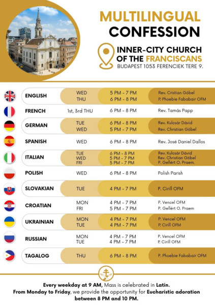 Az új lelkipásztori év kezdetével megerősítve működik tovább az Alcantarai Szent Péter-templom, közismert nevén a belvárosi ferences templom (Budapest V. kerület, Ferenciek tere) idegen nyelvű gyóntatói szolgálata. Ennek lehetőségeit szívesen ajánlják a fővárosban tartósan vagy ideiglenesen tartózkodó külföldieknek, az idegen nyelvű lelkipásztorkodás közösségeihez tartozó híveknek.