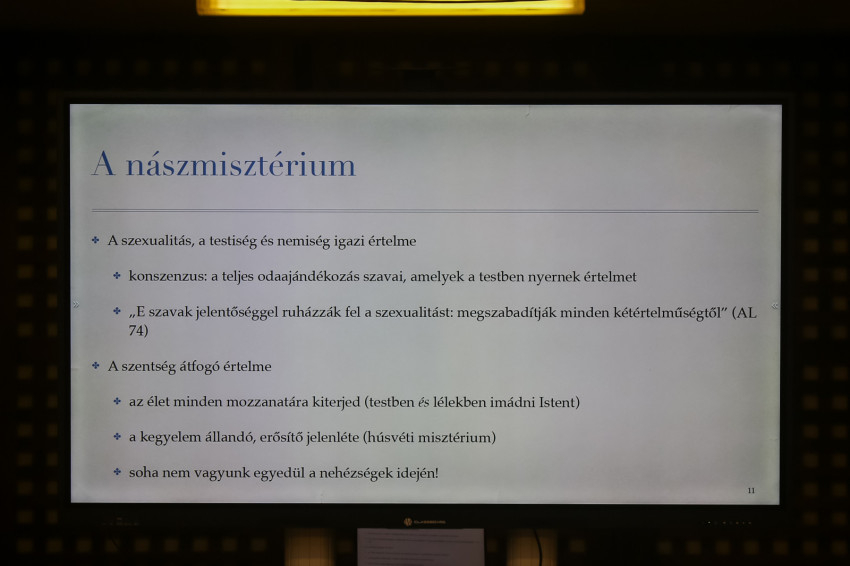A testnek fontos szerepe van az imában, mint ahogy a nászmisztériumban is testben és lélekben imádjuk Istent. Régen az imádság mindig testi cselekvés is volt, a néma imában is kellett az ajkat mozgatni. Mi már elhittük, hogy lehet fejben imádkozni, de a testnek ott kell lennie az imádságban – figyelmeztetett Török Csaba. – Az imádságot lehet minden élethelyzetben mondani, de annak nem az autóvezetés az alapállapota. Loyolai Szent Ignác és más szentek sokat foglalkoznak azzal, hogy megérkezünk-e az imádságba, jelen vagyunk-e a jelenlét számára. A házasság szükségszerűen testi és lelki szinten teljesíti be a szentségi jelet.