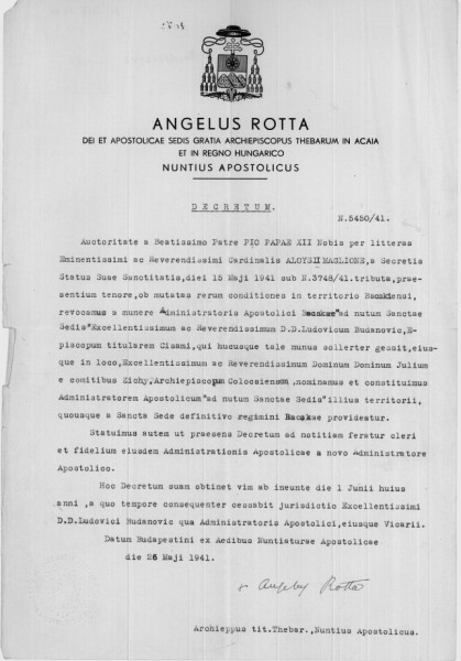 Angelo Rotta apostoli nuncius 1941. május 26-i dekrétuma