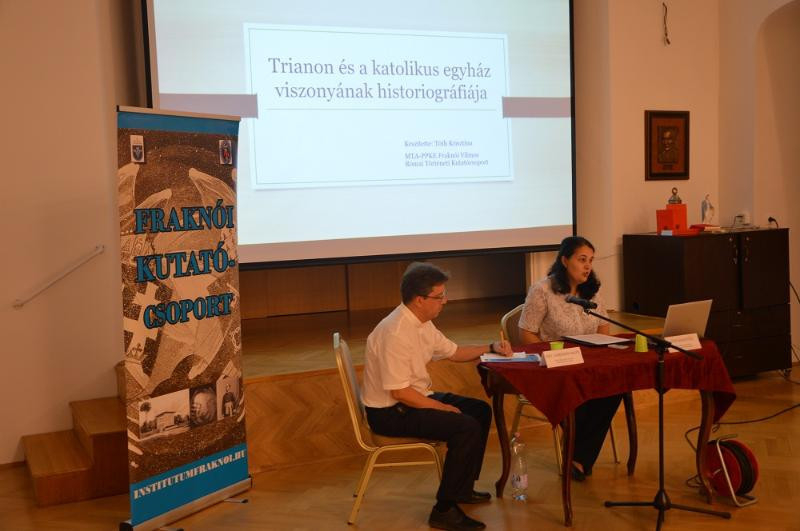 Az első előadó, Földvári Katalin, a MTA-SzAGKHF Lendület Görögkatolikus Örökség Kutatócsoport tudományos segédmunkatársa görögkatolikus témát választott: a máriapócsi baziliták megújulását és útkeresését vázolta Trianont követően elsősorban a korabeli sajtótermékek nyomán. A második előadó, Klestenitz Tibor (NKE HHK Honvédelmi Jogi és Igazgatási Tanszék) arról beszélt, hogy hogyan artikulálódtak Trianon egyházkormányzati következményei a korabeli sajtótermékekben. A konferenciát a Trianon és az Egyház témával foglalkozó, eddig megjelent szakirodalmat felvonultató historiográfiai összegzés zárta, Tóth Krisztina, a Fraknói Kutatócsoport tudományos munkatársa előadásában. Megállapította, hogy több elszakított vagy határok által ketté vagy háromfelé vágott egyházmegye 1920-as évekbeli története nincs kellőképpen feltárva, és azzal kapcsolatban is vannak még a kutatás számára fehér foltok, hogyan érintette a szerzetesrendeket a trianoni békeszerződés. Felhívta továbbá a figyelmet arra, hogy nemcsak a történettudomány, az egyháztörténet számára tartogat még további munkát e témakör, hanem magyar nemzetpolitikai érdek is a kapcsolódó források feltárása, az elszakított területek egyházi viszonyainak megismerése és objektív, hazai és külföldi levéltári forrásokra támaszkodó bemutatása.