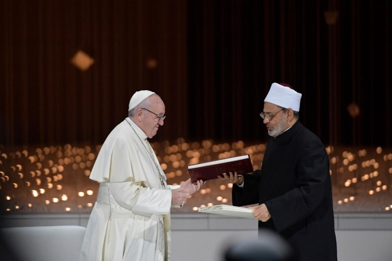 Ferenc pápa és Ahmad et-Tajjeb imám most aláírt egy dokumentumot, amely nemcsak határozottan elutasítja az Isten nevében elkövetett erőszakot, annak bármiféle igazolását, hanem fontos és kötelező érvényű megállapításokat is tesz az iszlámra és annak bizonyos értelmezéseire vonatkozóan. Elköteleződésre hív a különböző vallásúak hitének tiszteletben tartása, a diszkrimináció minden formájának elutasítása, az istentiszteleti helyek védelme, a vallásszabadsághoz való jog és a nők jogainak elismerése mellett.