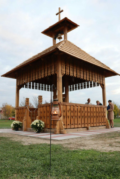 A haragláb felállítását még a múlt évben, a helyi római katolikus templom 250. évfordulóját köszöntve határozták el az egyesületet alapító helybeli művészek – többek között Szügyi László fafaragó és Nagy Péter kötélgyártó. Munkájuk az egyesület nyári művésztelepén vett lendületet; akkor készült el Bárdi Andrea makói fafaragó jóvoltából a Szent Mihályt és Nepomuki Szent Jánost ábrázoló benti két szobor is. Maga a harangláb négyszer négy méteres alapterületű és hét méter magas. Anyaga tölgyfa, hasított zsindelye fenyőből készült. A harang 25 kilós, a tiszaeszlári Vajda László műkovács, a Magyar Művészeti Akadémia tagja öntötte rézből.