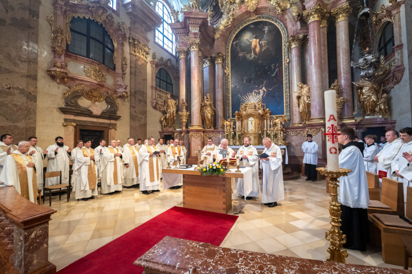 Major Fulgent győri bencés atya pappá szentelése a győri bencés templomban 2025. május 31-én, középen Várszegi Asztrik emeritus főapát