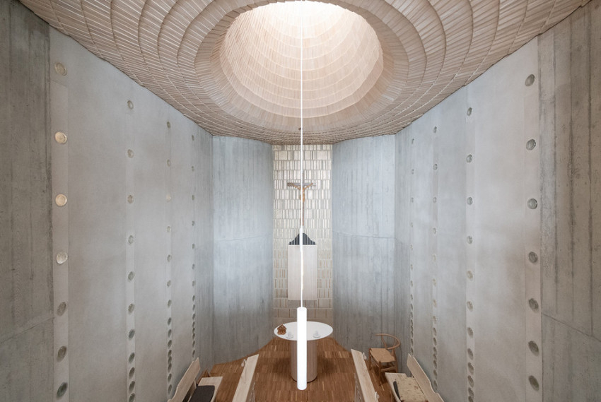 A kápolna, amely a központi tengely legmagasabb szintjén található, az építészeti kompozíció csúcspontja. Egy fordított paraboloid térfogat fedi, zsindelyezéssel burkolva, és az ég felé nyílik, ami a vertikális feszültség oldásának hatását kelti, és szándékos szakítást jelez az együttes többi részében jelen lévő emberi léptékkel.