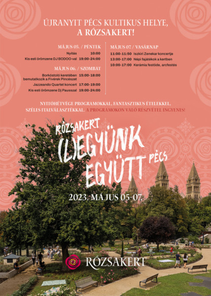 Minden betérőnek élményt kínálnak a szeretet, a nyugalom, a minőségi kikapcsolódás, az élőzene, az illatok és a felejthetetlen ízek jegyében, amelyek megfűszerezik a náluk töltött időt. A nyitó hétvégén, május 5–7-én színes programok közül válogathatnak az érdeklődők – olvasható a Rózsakert honlapján. Lesz jazzkoncert, örömzenélés, borkóstoló és anyák napi családi nap.