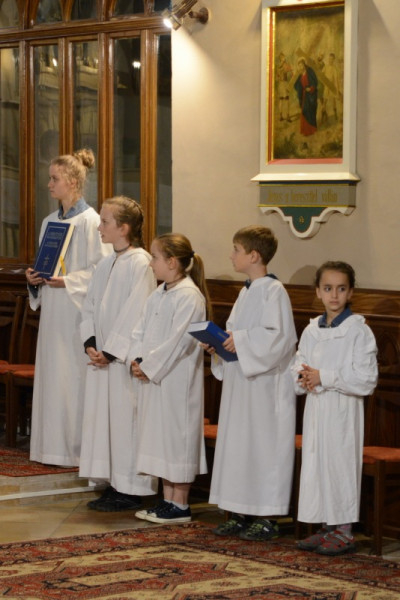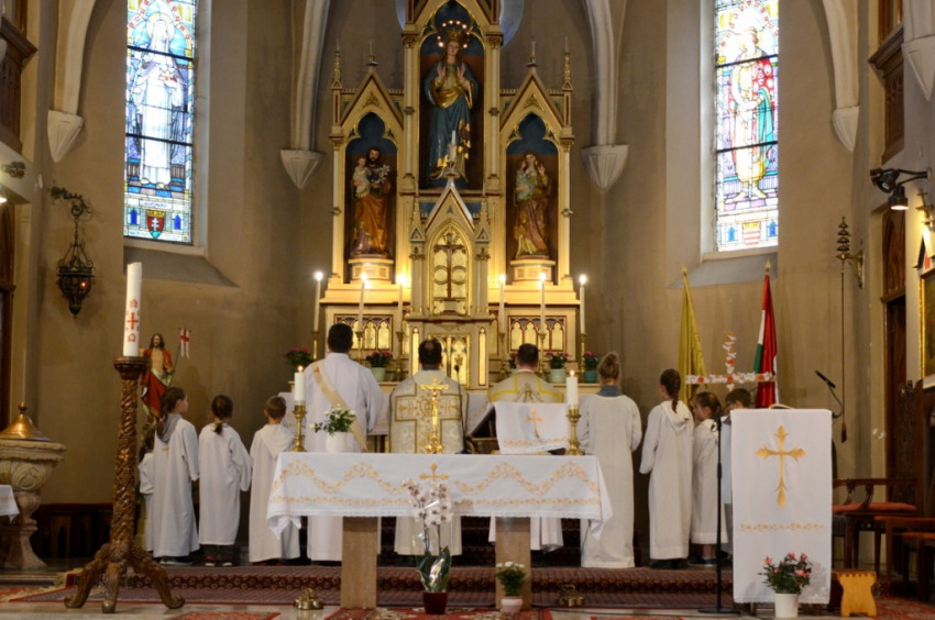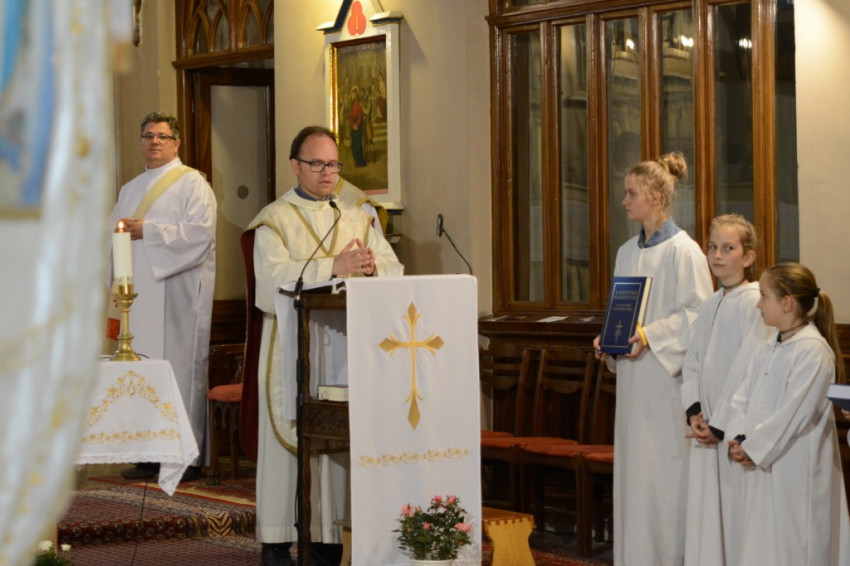 A beszéd végén a jelenlévők mindannyian a főoltárhoz vonultak, melyről a Nagyboldogasszony tekint le a templomban imádkozókra. Égi Édesanyánk előtt a papság vezetésével felajánlották a két plébánia híveit, családjait a Szűzanyának, Szent II. János Pál pápa egyik fatimai imájának szavaival.
