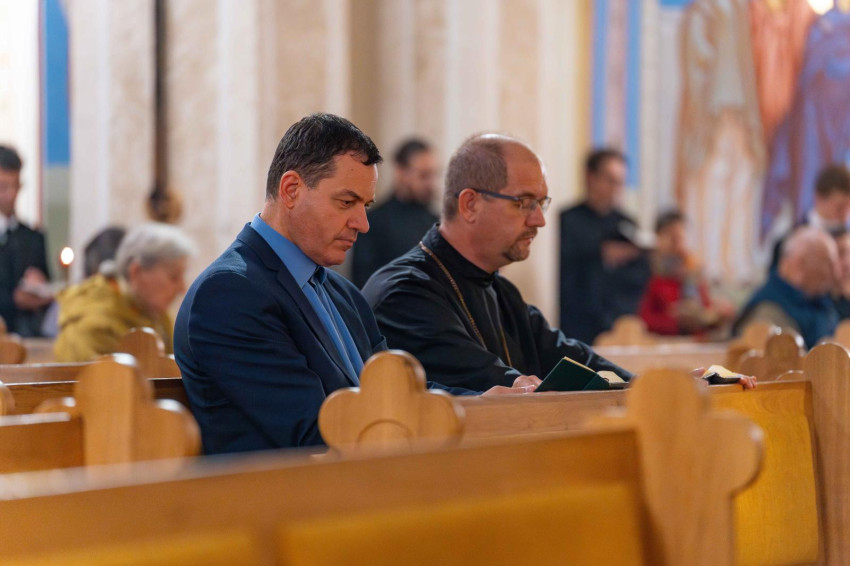 Együtt imádkozott az oktatókkal, munkatársakkal és hallgatókkal, a papnövendékekkel a főiskola megbízott rektora, Odrobina László és Seszták István főhelynök, fenntartói megbízott.