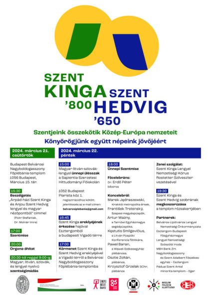 Az ünnepségsorozat kiemelt eseményeire március 22-én, pénteken kerül sor. 15 órakor ünnepi ülés lesz a Sapientia Szerzetesi Hittudományi Főiskola dísztermében, ahol a meghívott egyházi főméltóságok Szent Kinga és Szent Hedvig jelentőségét fogják méltatni a lengyel, litván, szlovák és magyar történelemben. Majd közös ünnepi nyilatkozatot fogadnak el, és írnak alá olasz nyelven, valamint a nemzeteik nyelvén. A nyilatkozatban megfogalmazzák, hogy Szent Kinga és Szent Hedvig életútját felidézve ismét tudatosítják, hogy jövőnk forrása csakis az itt élő emberek és nemzetek egymás iránti keresztény szeretete és szolidaritása lehet.