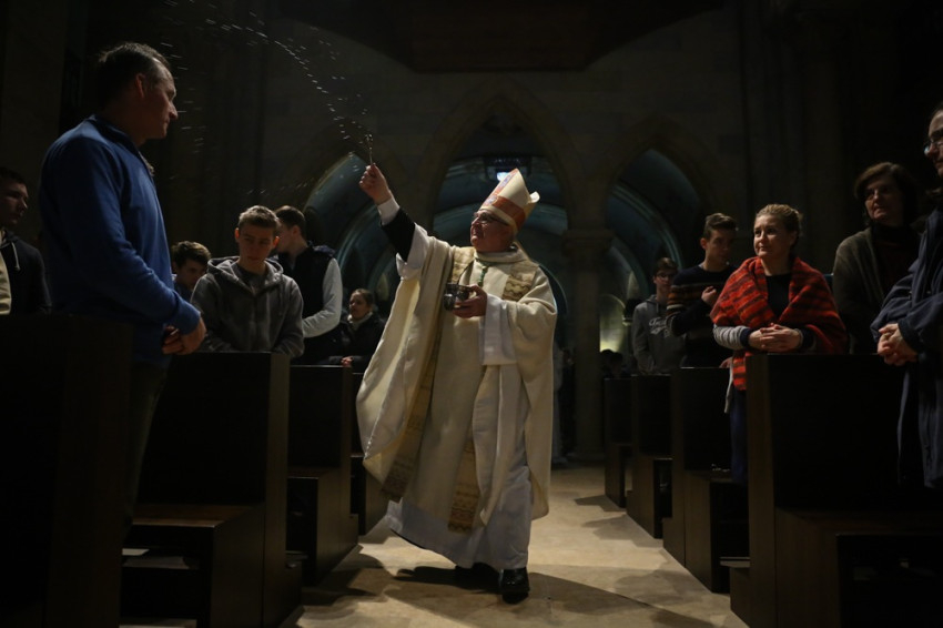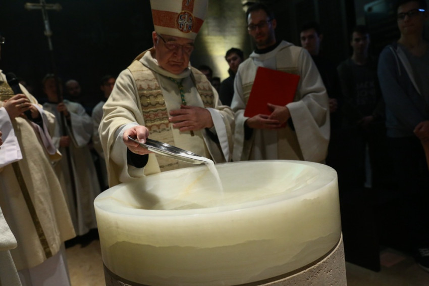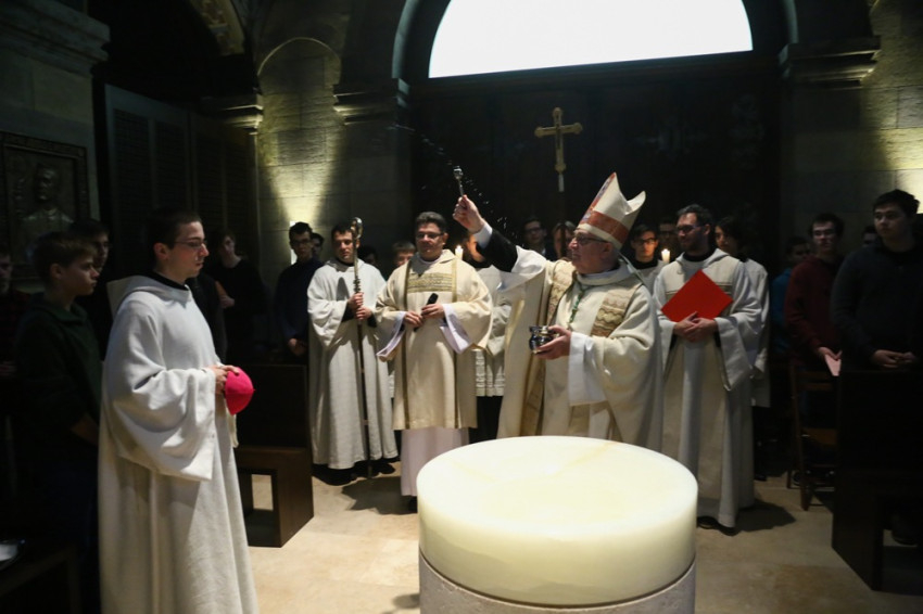 Az ünnepi szentmise kezdetén Várszegi Asztrik a bazilika tornya alatt, a bejárat előtti centrális helyen található keresztelőkúthoz vonult. Miután a ministránsok betöltötték a vizet a keresztelőkútba, a főapát megáldotta a sót és a vizet, majd egybevegyítette őket. Ezután a főcelebráns merített a szenteltvízből, és a templomban körbejárva meghintette a jelenlévőket.