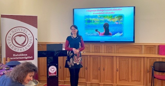 Csizmás Ágnes, a Katolikus Szeretetszolgálat módszertani munkatársa A hangterápia lehetőségei a munkatársi rekreáció, valamint a szociális és gyermekvédelmi ellátások színterein címmel a hangterápia jelentőségéről beszélt.