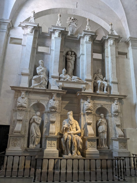 Ügyes volt a csoport, így a Szent Péter bilincsei bazilikába is bejutottunk, mielőtt a szieszta elkezdődött volna a templomőröknek. Ez a templom az ókori bíróság és a hozzá tartozó börtön helyén épült, ahol annak idején Péter apostolt halálra ítélték. A templomban őrzik Péter apostol római bilincseit, valamint itt gyönyörködhettünk Michelangelo világhírű Mózes szobrában is.