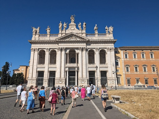 Innen a Lateráni bazilikába vezetett utunk, mely a katolikus világegyház főtemploma. Még ha a Vatikánban él is a pápa, Róma püspökének mindig ez lesz a temploma, nem véletlen, hogy itt őrzik Péter és Pál apostol fejereklyéjét.