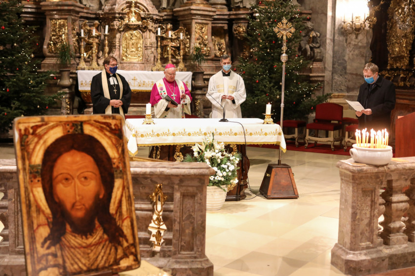 Sokszor emlegetjük, hogy szörnyű esztendő van mögöttünk – vezette be imádságát Fabiny Tamás evangélikus püspök. – Nem tudjuk, Isten mit tartogat számunkra, de bízunk és imádkozunk azért, hogy megvalósuljon Jézus szava, amit a názáreti zsinagógában olvasott fel a tekercsből, Izajás könyvéből: örömhírt hirdetek a szegényeknek, a foglyoknak szabadulást, a vakoknak látást… „és hirdetem az Úr kegyelmének esztendejét”. Azért imádkozunk, hogy az előttünk álló esztendő ne „annus horribilis”, szörnyű év, hanem az Úr kegyelmének esztendeje legyen. És hogy a mi szívünkben és reményeink szerint a világban is ölelje át egymást az igazság és a béke, ahogyan a 85. zsoltár szavaival korábban imádkoztuk. Mert ahogyan a béke világnapi üzenet is mondja, igazságosság nélkül nincs béke és béke nélkül nincs igazságosság. A kettő elválaszthatatlan.