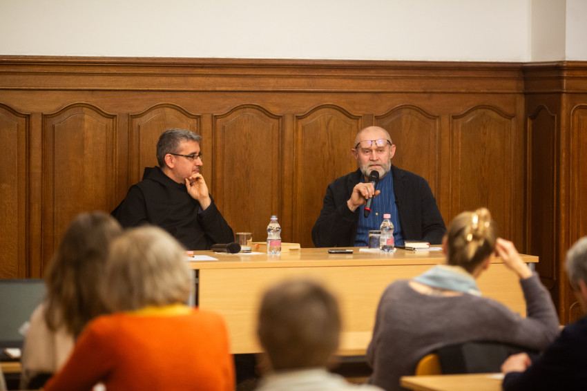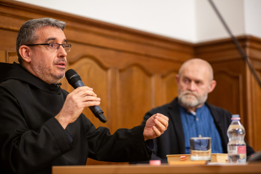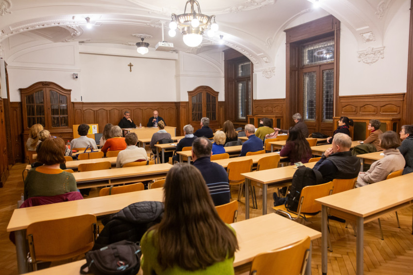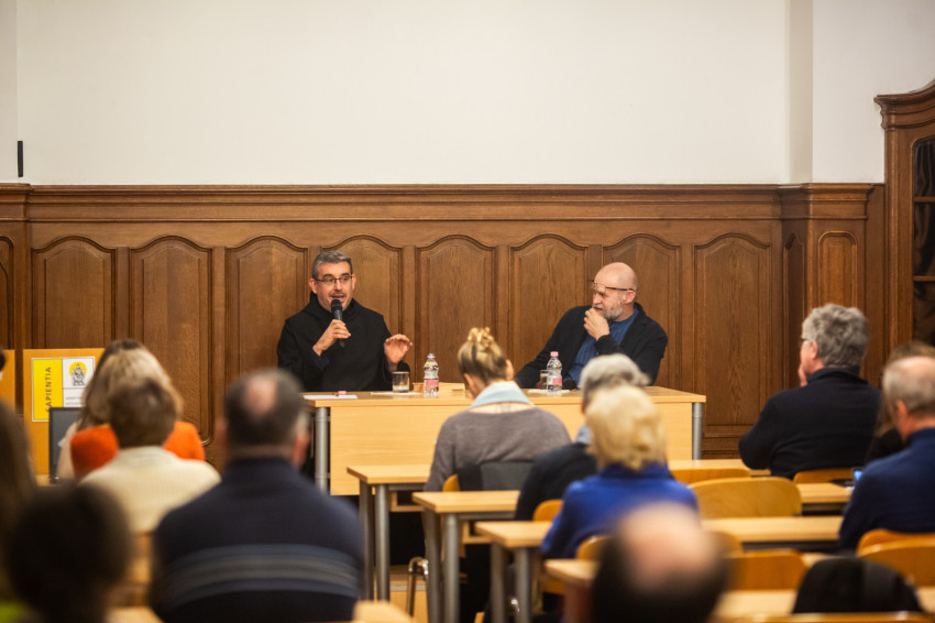 Fehérváry Jákó OSB, a Sapientia Szerzetesi Hittudományi Főiskola rektora és Guba András SchP stratégiáért és innovációért felelős rektorhelyettes (aki harcművészetet és szemlélődő imádságot is tanít a főiskolán) beszélt a meditáció, az imádság útján megtapasztalt küzdelmeiről.