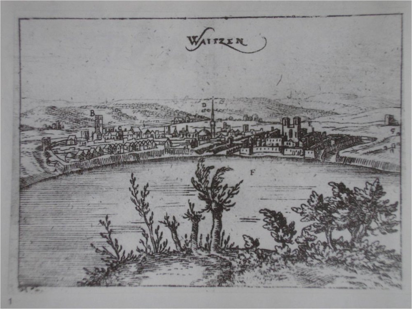 A váci vár Dillich 1600. évi metszetén, jobbra a Szűz Mária-székesegyház két nyugati tornya a vár (E betűvel jelölve) közepén (Magyarország Régészeti Topográfiája 9. kötet, szerk. Torma István)