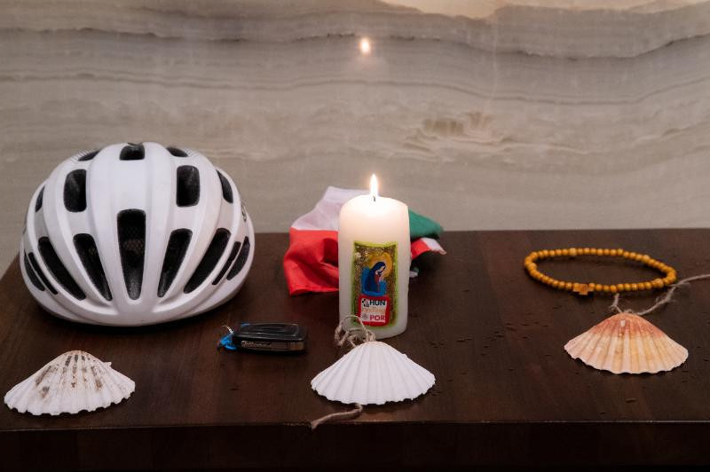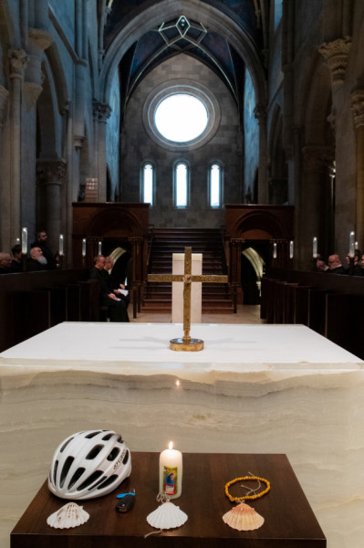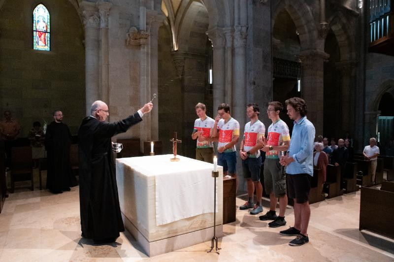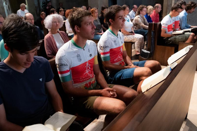 Egy-egy attribútum – Csongor a négyezer kilométeren át a biciklijén lobogó magyar zászló, Levente a kerékpáros sisakja, Andris a világtalálkozón kapott rózsafüzér, a kísérőautót vezető Áron és Barni pedig a slusszkulcs – letételével pedig jelképesen az út terhét is Isten elé helyezték, majd a bencés közösség felé fordulva, meghatódva az alábbi imával mondtak hálát: