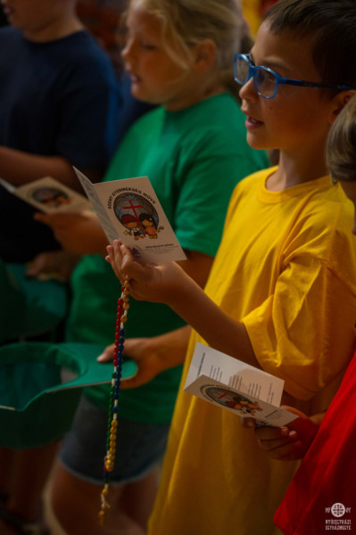 A kegytemplom padsoraiban ülő gyermekek színes pólóikban küldetésük jelképét, a színes rózsafüzér szemeit idézték: a kontinenseket jelentő különböző színek szimbolikusan is kifejezik az egységet a sokféleségben, ahogyan a világ különböző részein élő gyermekek is közös célért imádkoznak – a békéért, a szegényekért, az evangélium terjedéséért. E szombati liturgiát különösen is a kárpátaljai testvérekért ajánlották fel.