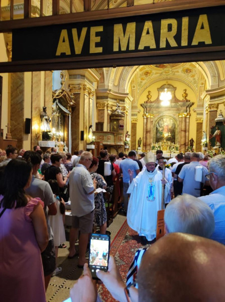 A magyar híveket a szombati napon, július 15-én a templomkertben magyar ajkú lelkiatyák várták, hogy a több száz éves hársfák árnyékában elvégezhessék a szentgyónást. Megható, ahogy sorokban várakozva éltek is a hívek ezzel a lehetőséggel. Aztán virágokkal díszített kereszttel az élen, énekszóval megérkeztek a felvidéki Mária-út zarándokai is, akik idén már nyolcadik alkalommal tették meg gyalog az útvonal egy részét. Majd következett a szabadtéri keresztút imádsága és az ünnepi litánia a kegytemplomban.