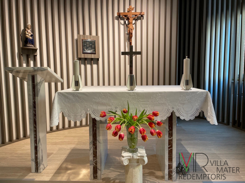 A recepció mellett kapott helyet a modern vonalvezetésű kápolna, melynek a klasszikus templombelsőkre utaló, félkörös oltártere bensőséges, imádságra hívó hangulatot áraszt.