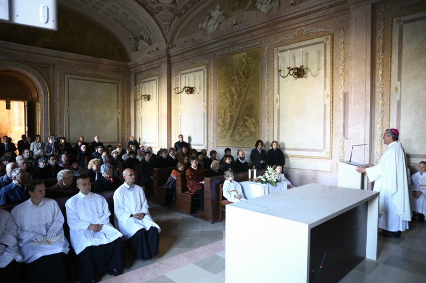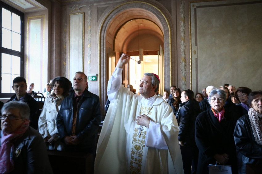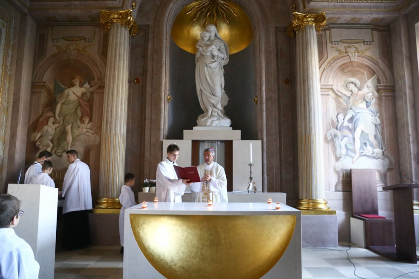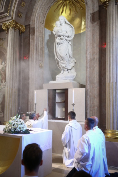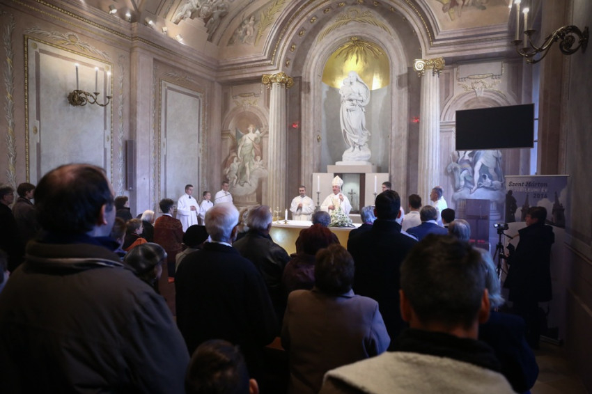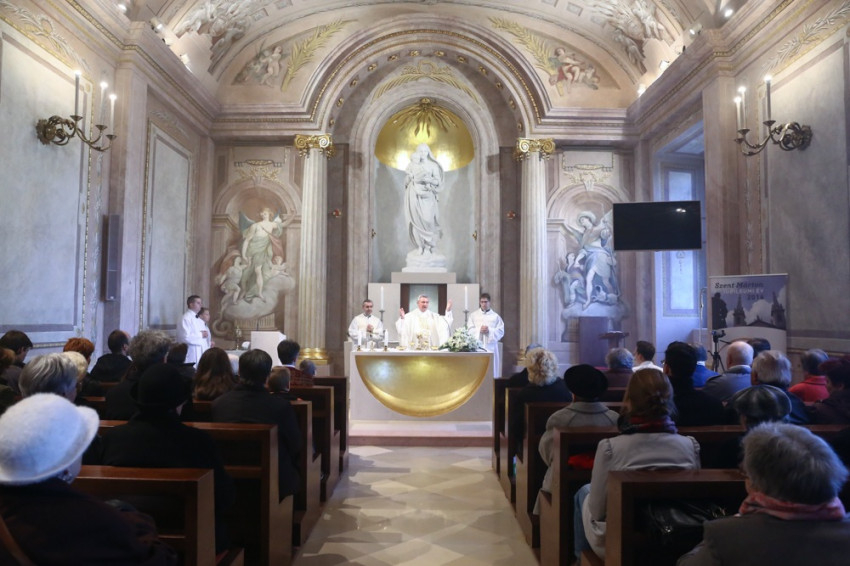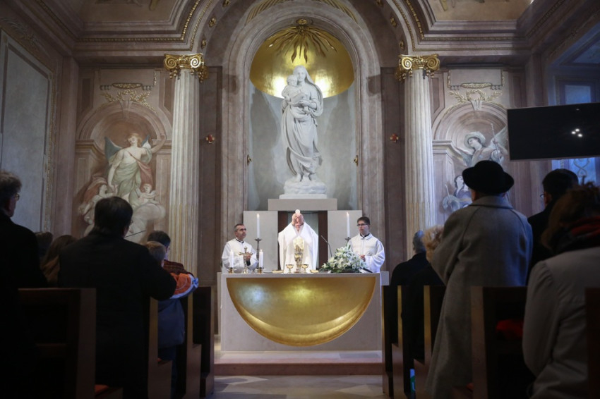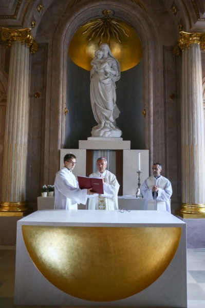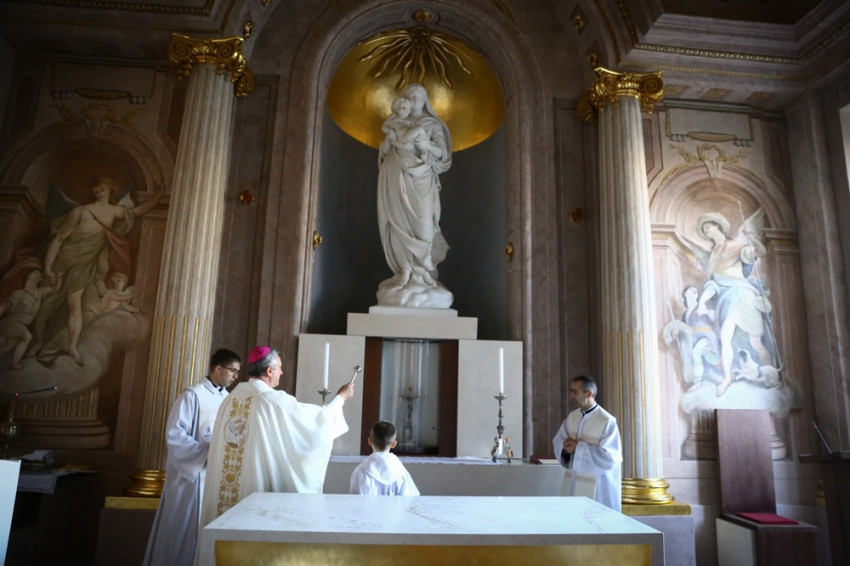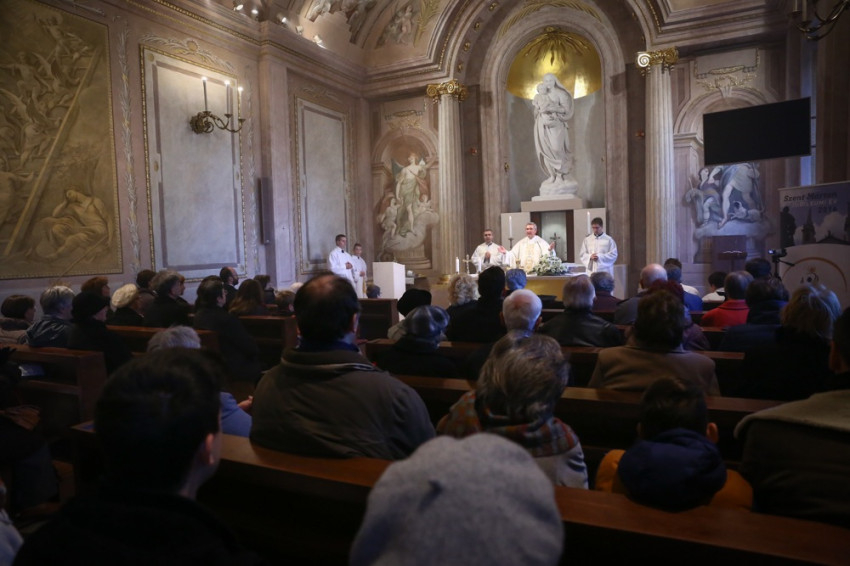 A Madonna-kápolna felszentelési szertartását magába foglaló, a felújított kápolna oltáránál bemutatott szentmise a vízszenteléssel kezdődött. Újraszenteljük a megújított kápolnát, hogy a közösségünk lelki templommá növekedjék, és összegyűlve az oltár körül gyarapodjék az égi szeretetben – imádkozott Veres András püspök a szertartás elején.