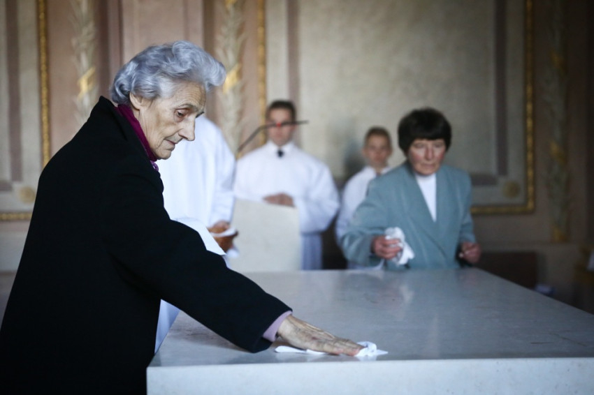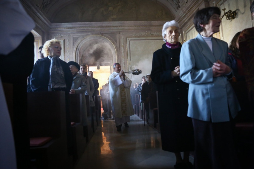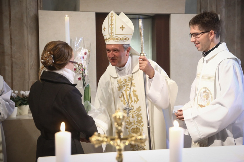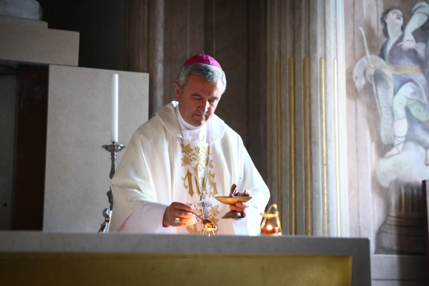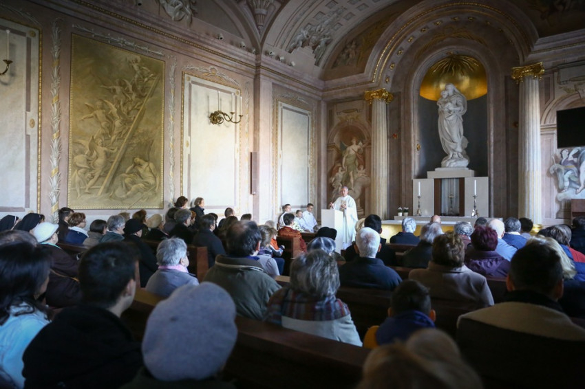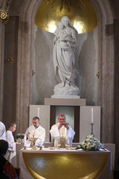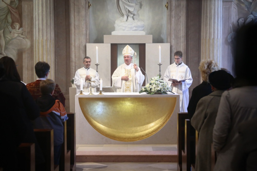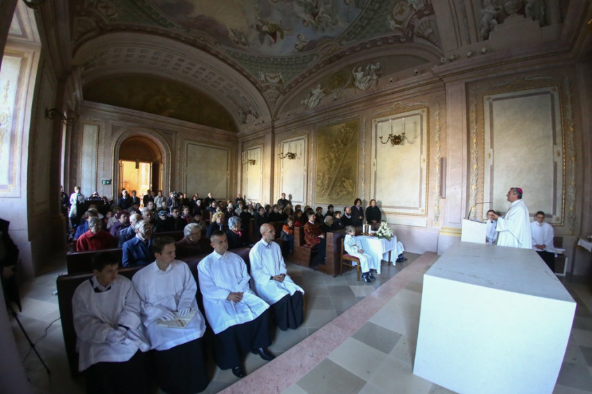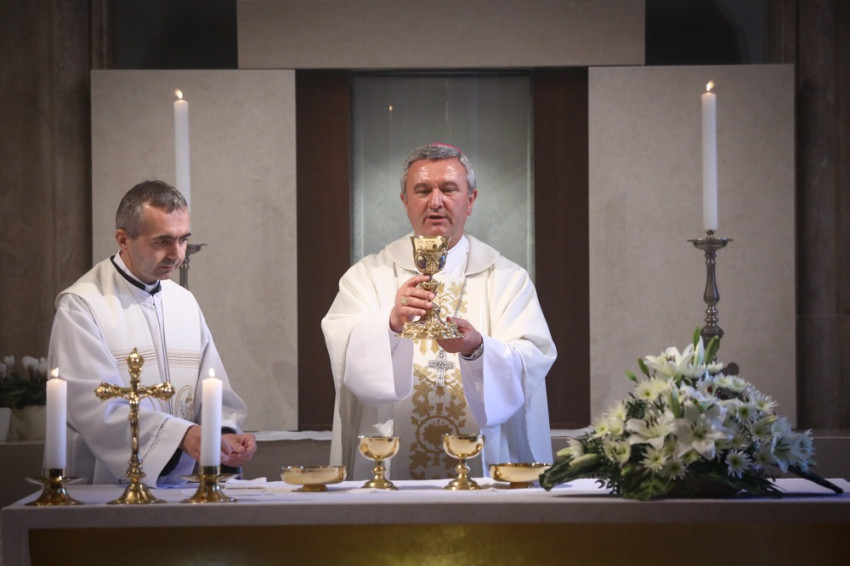 A Madonna-kápolna felszentelési szertartását magába foglaló, a felújított kápolna oltáránál bemutatott szentmise a vízszenteléssel kezdődött. Újraszenteljük a megújított kápolnát, hogy a közösségünk lelki templommá növekedjék, és összegyűlve az oltár körül gyarapodjék az égi szeretetben – imádkozott Veres András püspök a szertartás elején.