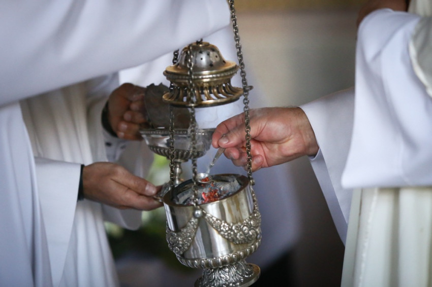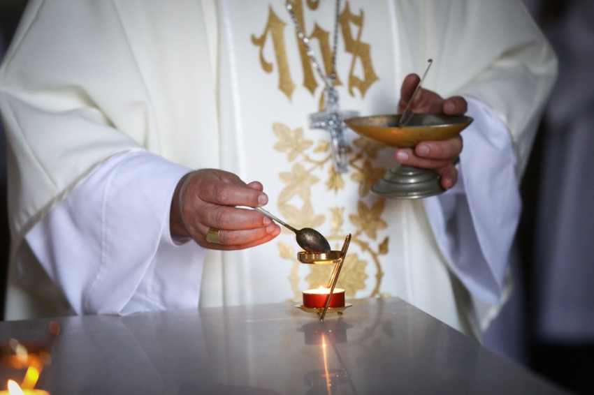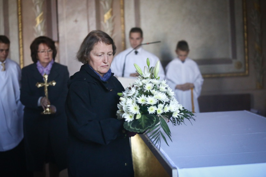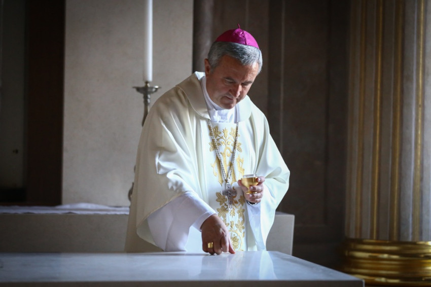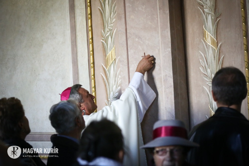 A homília után a Mindenszentek litániája elimádkozásával folytatódott a liturgia, amit a szentelés szertartása követett. Veres András a szenteltvízzel meghintette a falakat, majd az oltárt kente meg krizmával, és meggyújtotta a tömjént, az Isten dicsőítését kifejező lángot, végül pedig feldíszítették az oltárt, és a felajánlással folytatódott a szentmise.