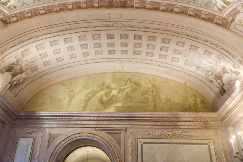 A kijárat feletti képen a vasvár–szombathelyi székeskáptalan történetét örökíti meg. Középen az alapítás jelenete látható, bal oldalon a káptalan első székhelye, Vasvár, jobb oldalon pedig Szombathely, ahova az 1578. évi országgyűlés a káptalant áttelepítette.