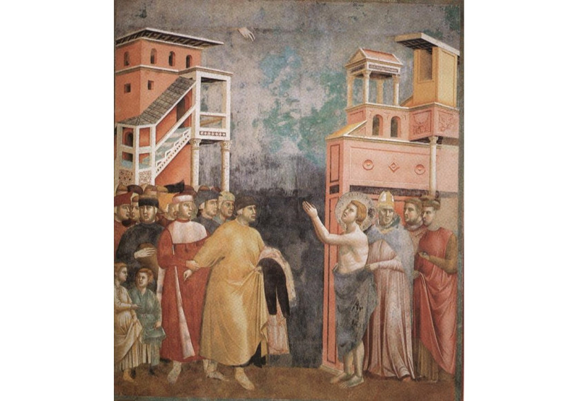 Fotó: Wikimedia Commons (Giotto di Bondone: Szent Ferenc szakít apjával; Ferenc a köpenyét egy szegény embernek adja)