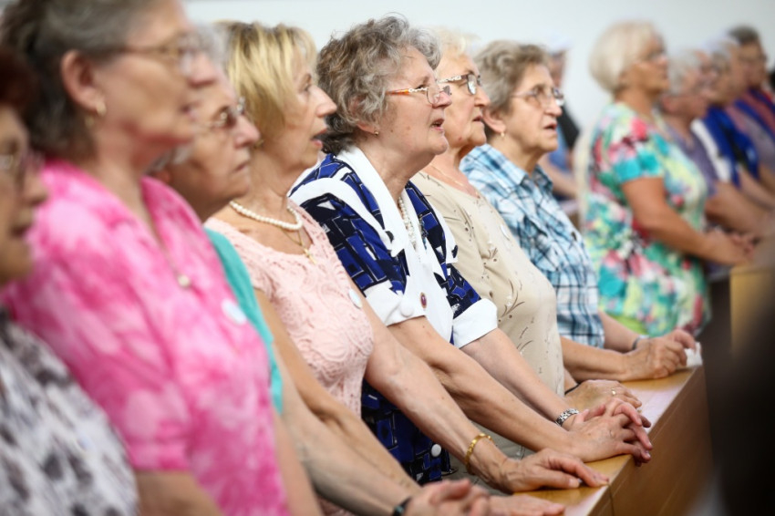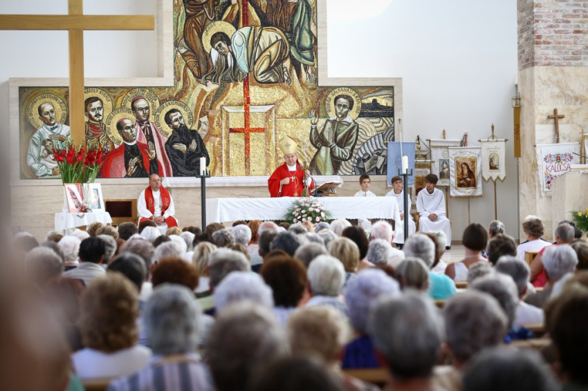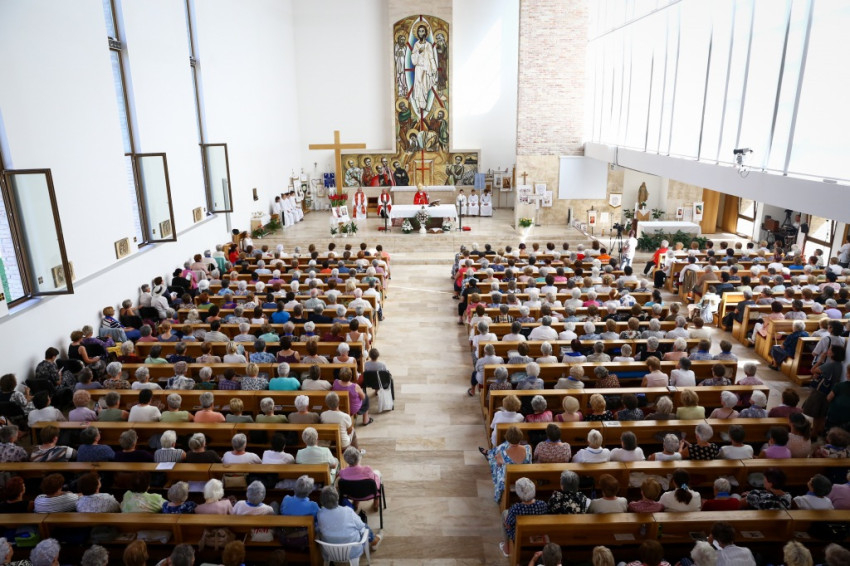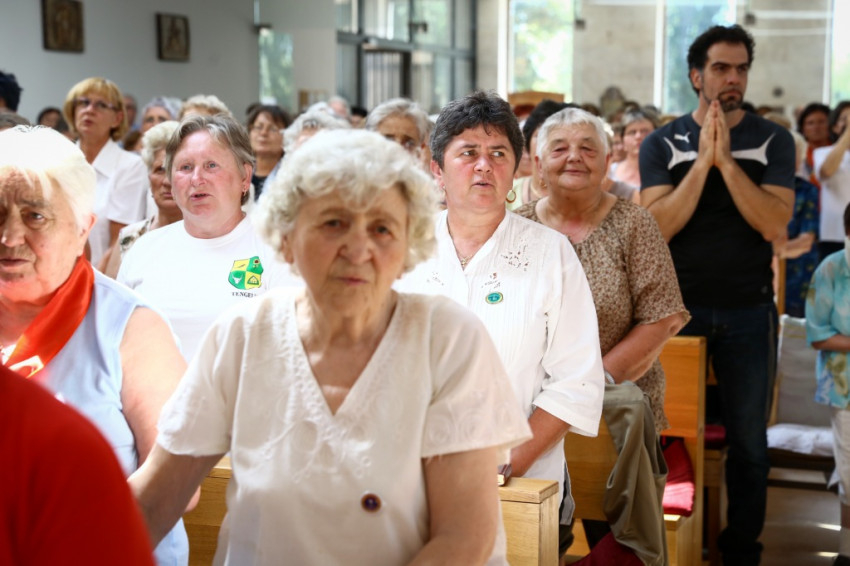 Az oltárt kétfelől övező zászlók sokasága árulkodott arról, mely településekről érkeztek zarándokok. A segítők, a templomot színültig megtöltő hívek közt kis fonott kosarakban gyűjtötték az imaszándékokat.