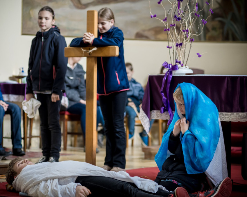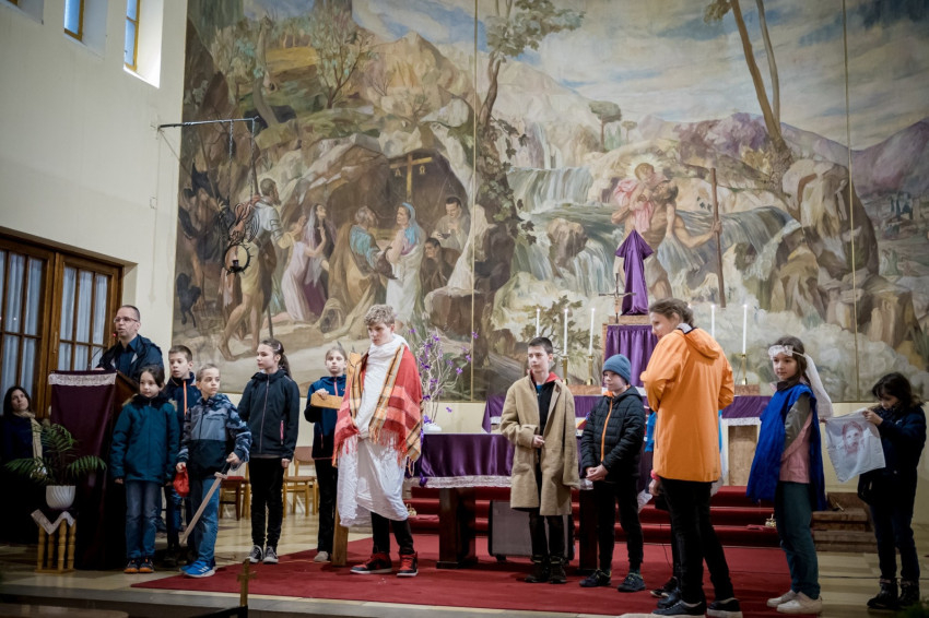A családok képviselői együtt olvastak fel elmélkedéseket, amelyek a mindennapi élet nehézségeiről szólva kísérték Krisztust a fájdalmak útján. A gyermekek Jézus szenvedéstörténetének szereplőit szavak nélkül, pantomimszerűen jelenítették meg.