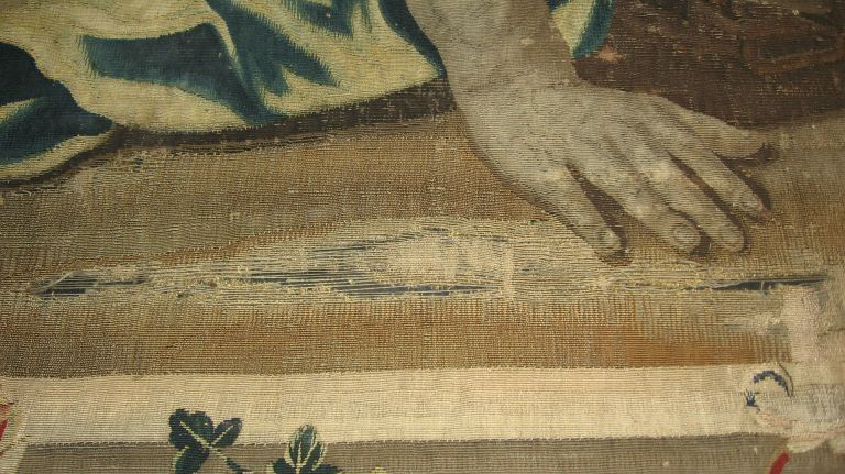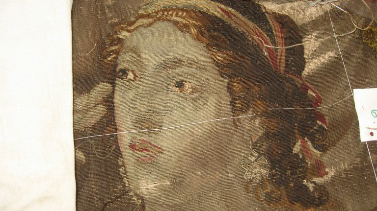 A felújítás előtti és utáni állapot az egyik kárpit részletén