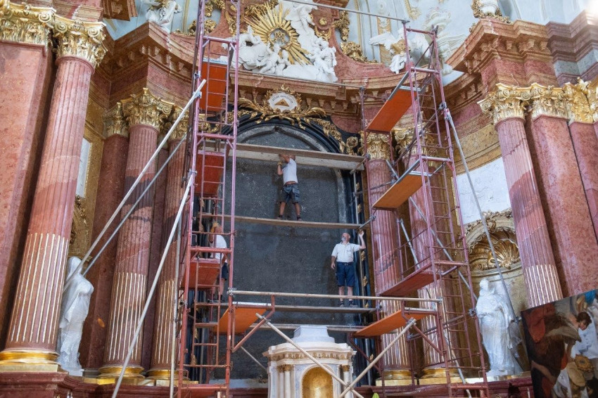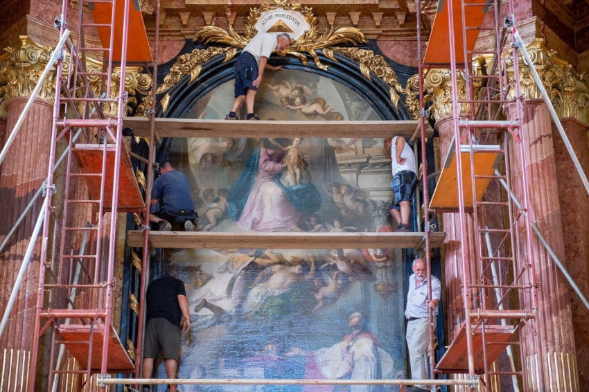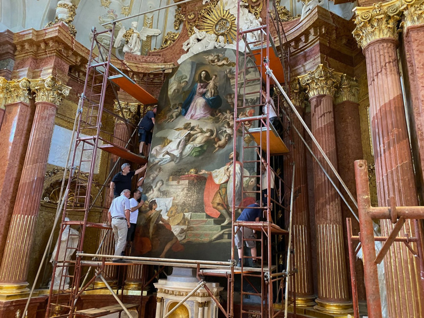 A főoltárkép mellett az utóbbi hetekben visszakerültek a templomtérbe a szintén restaurált mellékoltárképek és szobrok is. A mellékterek, sekrestyék, oratóriumok restaurált berendezésének visszaépítése folyamatosan zajlik.