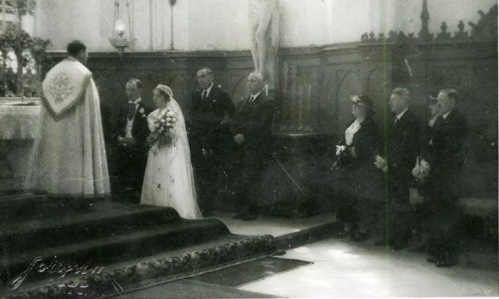 Dsida Jenő és Imbery Melinda esküvője a kolozsvári Szent Mihály-templomban 1937-ben. Az eskető pap Márton Áron volt,
