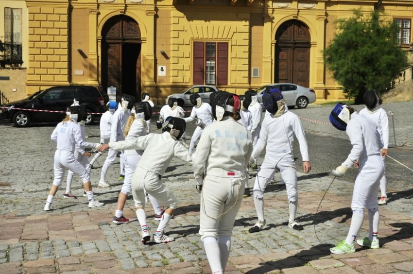 A Dóm téren fél 11-kor kezdődött a flashmob, az úgynevezett „Fencingmob” amelyen a PEAC-os vívók – kicsiktől az idősekig – beöltözve tartottak bemutatót – tájékoztat a Pécsi Egyházmegye.