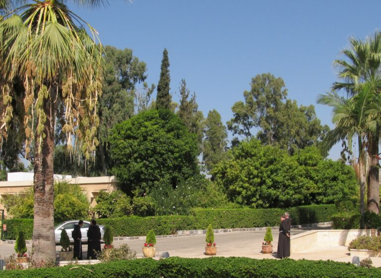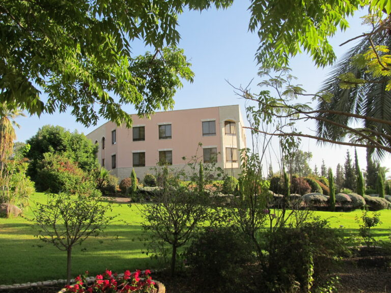 Szünetekben jólesik a séta a ház körül: rengeteg növény, virág, a dombról a tó látványa, a fények a vízen, túloldalt a Golán magaslatai. A nővérek örülnek, hogy itt vagyunk náluk: ez a kongregáció sok helyütt együtt dolgozik a Kusztódiával – a haifai kórházban ettünk a náluk szedett datolyából még októberben. Itt ők vezetik a kegyhelyet, ferencesek csak lent a tónál, Kafarnaumban és Tabghában vannak. A tulajdonos az ANSMI, a misszionáriusokat támogató olasz állami egyesület.