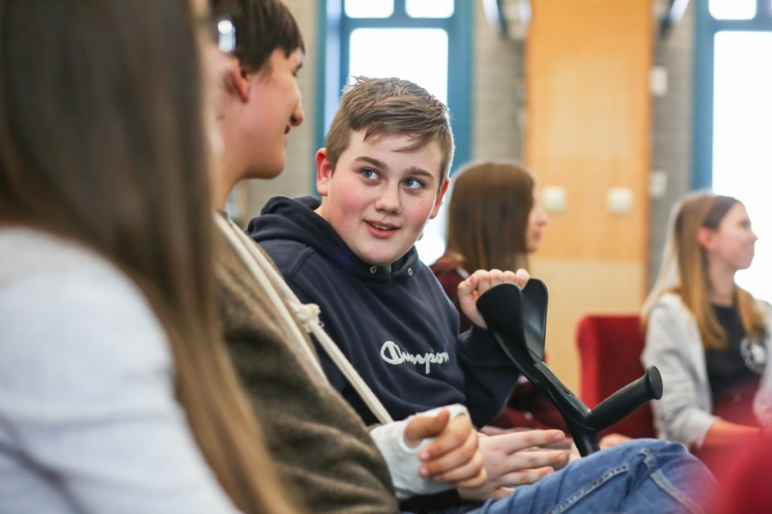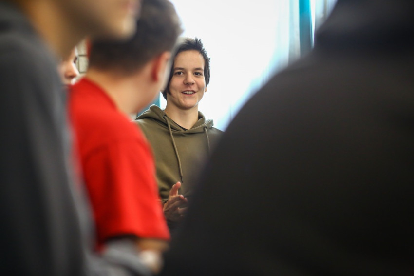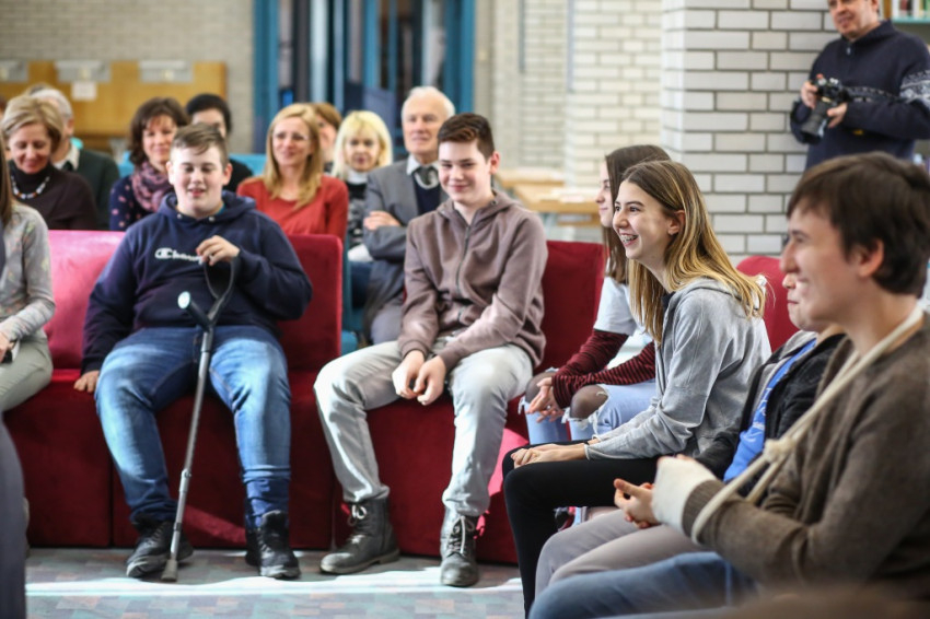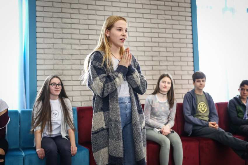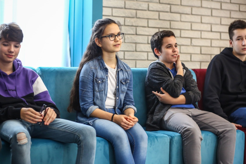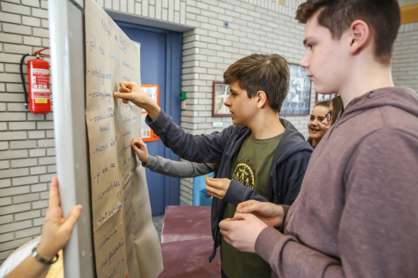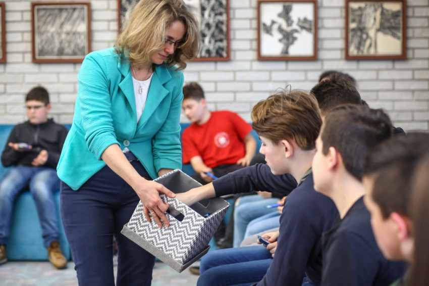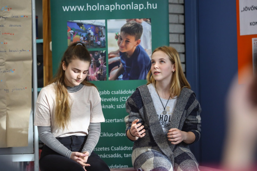 Bár már gyakorlott társaságról van szó, mégis megilletődötten ültek le a gyerekek az érdeklődők előtt nagy körben elhelyezett fotelekbe. Éva és Andrea bátorító kérdései és a feloldódást, ráhangolódást célzó játékos feladat segítettek megérkezni. Nehezen indult el a beszélgetés, a gyerekeket sokan figyelték, de a módszernek – interaktív, dinamikus, szemléltető – köszönhetően egyre jobban belemelegedtek a beszélgetésbe, és az óra közepén már megfeledkeztek arról, hogy bemutatón vannak. Oldottak, nyitottak voltak, elmélyedtek a kérdésekben.