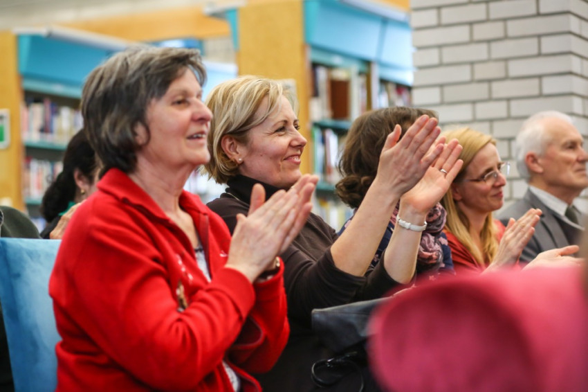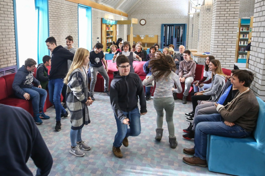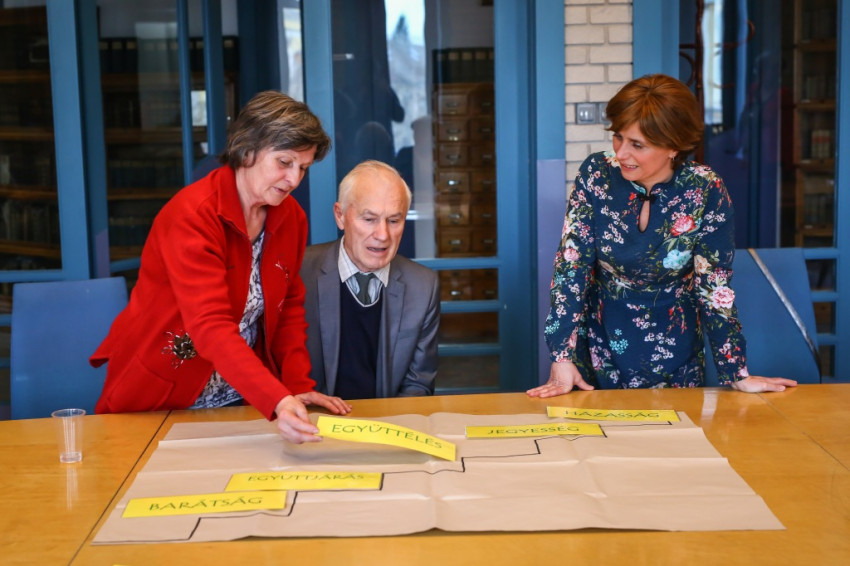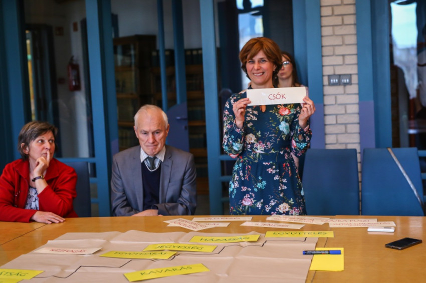 A kulisszát nem csak a könyvek adták – a Piaristák teréről a nagy ablakokon keresztül betekint a könyvtárba a rend temploma és iskolájának épülete. A meghívás konferenciára szólt, de a CSÉN-program szemléletének megfelelően nem frontális előadás részesei voltunk. CSÉN-mentorok – Déri Éva biológus és Agócs Andrea szociálpedagógus, katolikus hitoktató, mentálhigiénés szakember – tartottak a meghívott piarista diákokkal bemutató családórát. A szervezők így élményszerűen mutatták be, mit jelent a CSÉN, utána pedig fórumra hívták a részt vevő felnőtteket, értékelni, kérdezni, értelmezni, megismerni a látott gyakorlat elméleti hátterét.