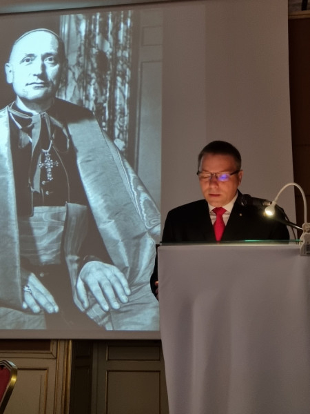 Végül Tóth Krisztina vatikáni levéltári delegátus vázolta a vörös és fehér mártírokat bemutató kiállítás szakmai koncepcióját, amely Magyarország Szentszéki Nagykövetsége, a Vatikáni Magyar Levéltári Kirendeltség, a Nemzeti Emlékezet Bizottsága, a Mindszenty Alapítvány és a zalaegerszegi Mindszentyneum együttműködésének eredményeként született meg. Felhívta a figyelmet arra, hogy egy nemzetnek fontosak az erős és szilárd gyökerek, a mártírok példája, mivel ezek segítségével tud szembenézni a jövő kihívásaival. E kiállítással együtt egy Mindszenty József életét bemutató tárlatot is megtekinthettek a jelenlévők.