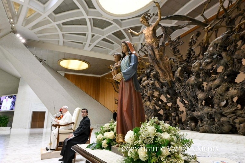 A Szentatya emlékeztetett, hatvan évvel ezelőtt volt a cigányok első nagy katolikus világtalálkozója, 1965. szeptember 26-án a Róma melletti Pomeziában, amelyen Szent VI. Pál pápa is részt vett. Ennek az eseménynek a tanújaként áll ma itt a Szűz Mária, „a romák, szintók és vándorló népcsoportok királynője” szobra, amelyet a pápa maga koronázott meg.