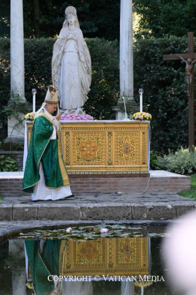 Ezen a szép napon mindenekelőtt arra szeretnék hívni mindenkit, kezdve magammal, hogy éljük meg azt, amit mondhatni egy „természetes” székesegyház szépségében ünneplünk, a növényekkel és a teremtés oly sok elemével, melyek ide hoztak bennünket, hogy az eucharisztiát ünnepeljük, melynek jelentése: ’hálaadás az Úrnak’.
