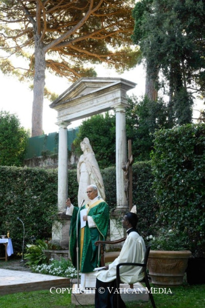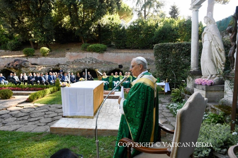 Én személyesen is szeretnék köszönetet mondani sok itt jelenlévőnek, akik e téren dolgoztak a liturgiáért. Mint tudjátok, a liturgia az életet képviseli, ti pedig ennek a Laudato si’ Központnak az élete vagytok. Szeretnék köszönetet mondani ebből az alkalomból mindazért, amit Ferenc pápa e csodálatos inspirációját követve tesztek, aki ezt a kis részt, ezeket a kerteket, ezeket a tereket éppen azért adta, hogy folytassuk azt az oly fontos küldetést mindannak tekintetében, amit tíz évvel a Laudato si’ közzététele után tudunk: a teremtett világ, közös otthonunk gondozásának szükségességéről van szó.