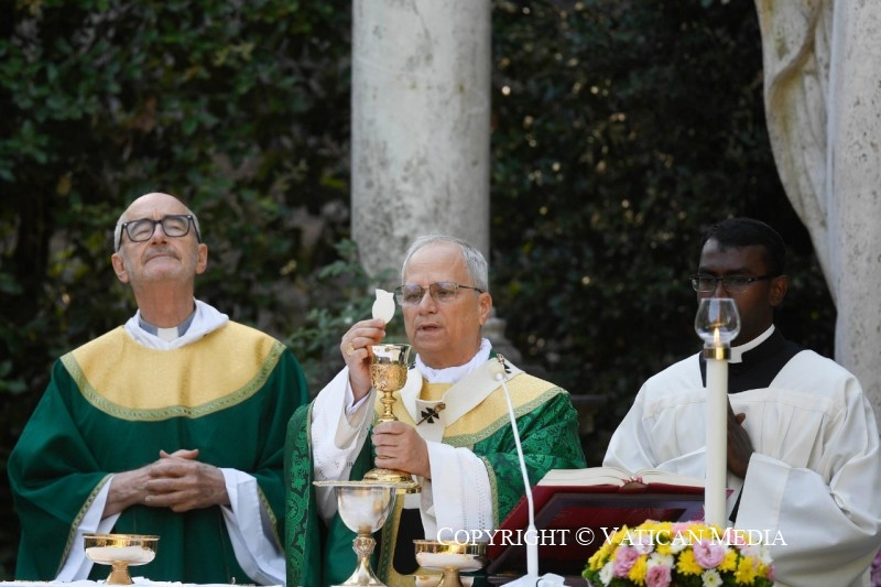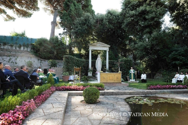 Mindezek elmondása után, van egy homíliám is, melyet előkészítettem és meg fogok osztani, csak egy kis türelmet kérek: van itt néhány elem, melyek valóban segítenek folytatni ezt a délelőtti elmélkedést, megosztva ezt a családias és derűs pillanatot egy olyan világban, amely ég, mind a globális felmelegedés, mind a fegyveres konfliktusok miatt, amik oly időszerűvé teszik Ferenc pápa Laudato si’ és Fratelli tutti kezdetű enciklikáinak üzenetét.